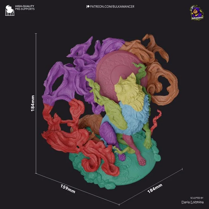 3D Printed Figure of a Celestial Wolf. The creator if this model is Bulkamancer, I am a licensed seller for this artist, and you can file her STL files https://cults3d.com/en/users/Bulkamancer/3d-models